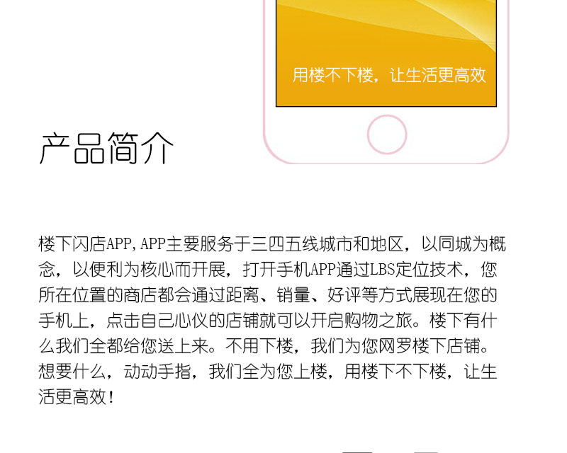 楼下闪店APP,APP主要服务于三四五线城市和地区,以同城为概念,以便利为核心而开展,打开手机APP通过LBS定位技术,您所在位置的商店都会通过距离、销量、好评等方式展现在您的手机上,点击自己心仪的店铺就可以开启购物之旅。楼下有什么我们全都给您送上来。不用下楼,我们为您网罗楼下店铺。想要什么,动动手指,我们全为您上楼,用楼下不下楼,让生活更高效!